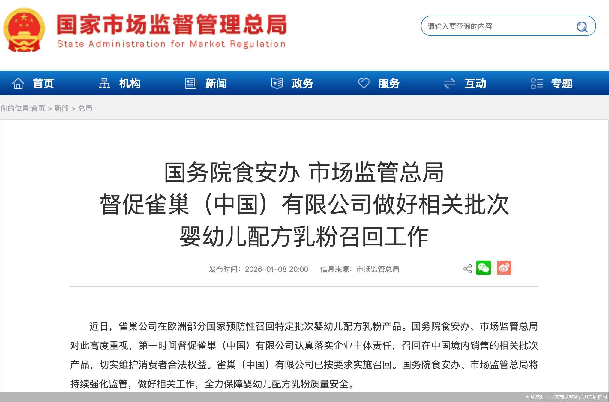 1月8日,雀巢集团再度颁布音尘称,能够存正在有毒污染影响的婴小儿配方奶粉,正在环球召回规模进一步扩张至50邦。当天晚间,邦度墟市监视管束总局官网通告,邦务院食安办、墟市监禁总局对此高度珍重,第有时间促进雀巢(中邦)有限公司讲究落实企业主体义务,召回正在中邦境内出售的相干批次产物,真实保护消费者合法权力。